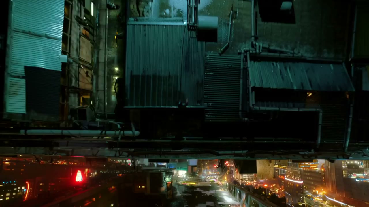 A cinematic first-person perspective tracking shot of a person in a futuristic suit running across a rainy rooftop at night. Neon lights in pink and cyan reflect off the wet surfaces, with a sprawling cyberpunk city skyline in the background. High-speed movement, motion blur, 4k.