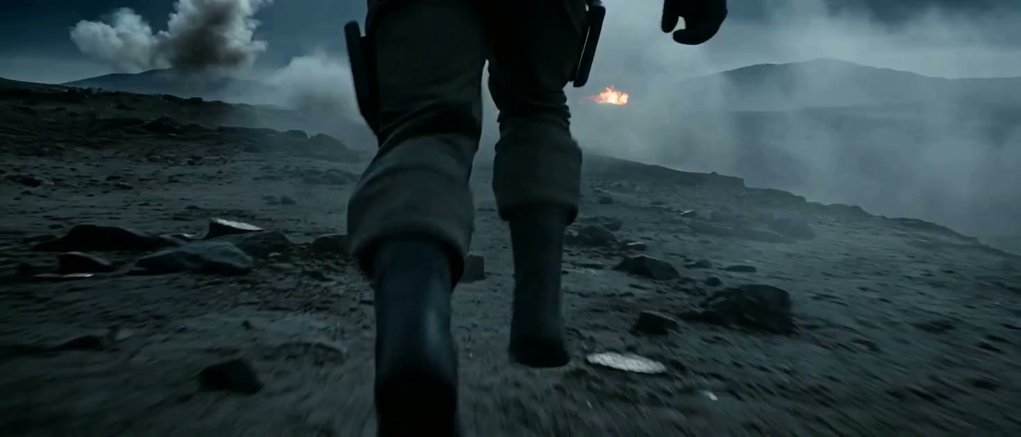 A low-angle, dramatic tracking shot following a soldier in tactical gear running through a battlefield. Massive explosions with orange fire and thick grey smoke erupt in the background. Debris and dust fly through the air under a moody, overcast sky. Intense action, realistic cinematic lighting.