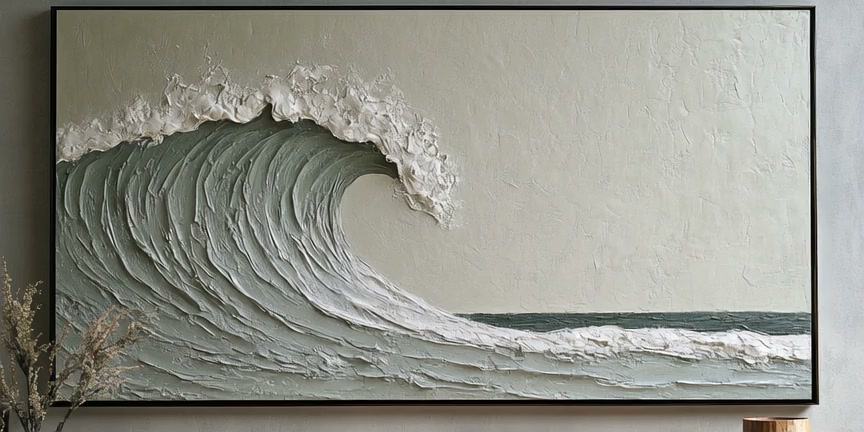 An elegant 3D textured oil painting of a massive ocean wave. The thick impasto brushstrokes create a physical relief effect. As the camera zooms in, the white sea foam and pale green water appear to move and crash realistically within the frame. Minimalist aesthetic, artistic and fluid.