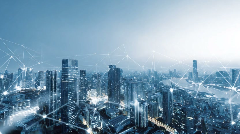 A futuristic aerial timelapse of a glowing blue smart city at dusk. Shimmering digital network lines and nodes connect the skyscrapers, symbolizing 5G connectivity and big data. The camera smoothly pans over the illuminated urban landscape and a river. High-tech, sleek, 4k.