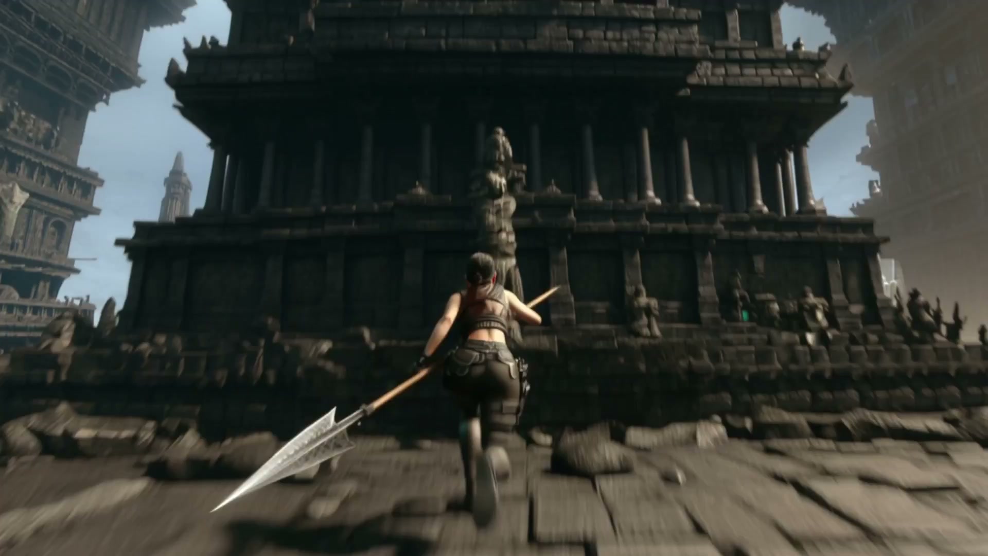 An epic cinematic shot of a warrior woman climbing a colossal, ancient stone temple. Suddenly, the temple transforms into a giant living stone creature with glowing eyes. Rubble falls as the creature awakens. High fantasy, grand scale, intense dynamic movement.