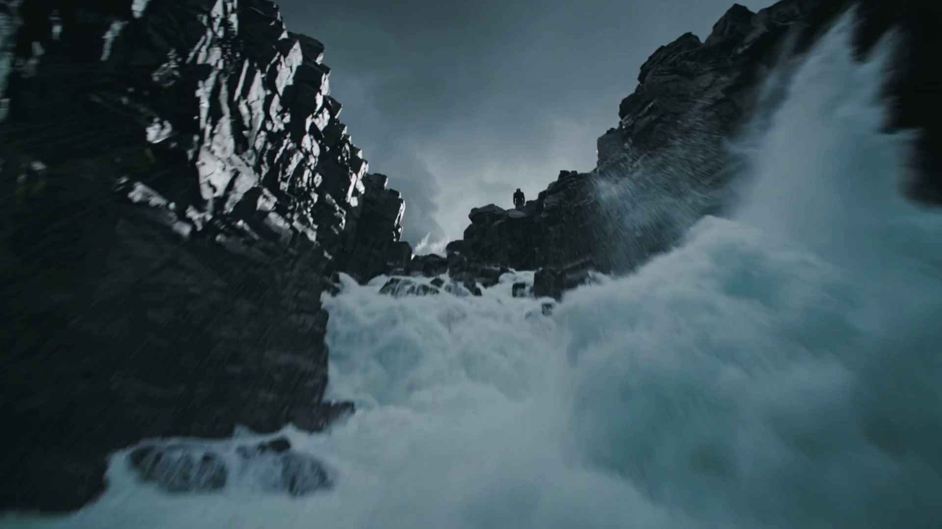 A cinematic wide shot of a lone figure standing on a jagged black rock overlooking a stormy ocean. Massive white waves crash against the cliffs under a dark, dramatic sky with swirling clouds. The camera zooms out slowly to reveal the vast, desolate coastal landscape. Epic, moody, 4k.